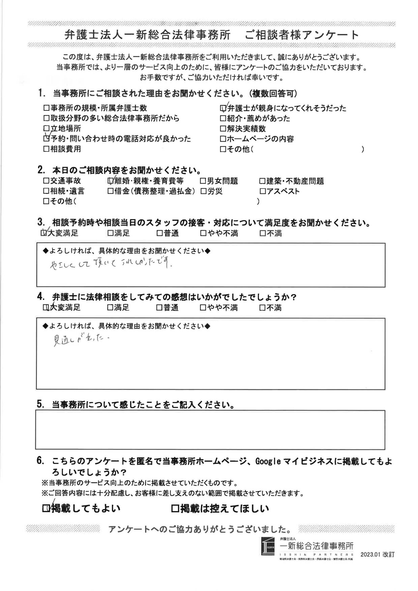 離婚・親権・養育費のご相談:「やさしくして頂いてうれしかったです。」